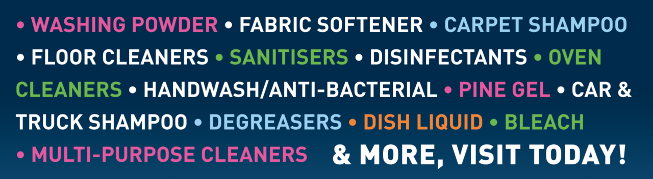 Our aim is to satisfy our customer’s requirements by supplying all the chemicals & cleaning equipment required for day-to-day usage in any environment. Our range includes household cleaning chemicals, industrial cleaning chemicals, detergents, disinfectants, sanitizing agents, specialised chemicals & maintenance products. We also distribute a full range of cleaning equipment, brushware & paper products.